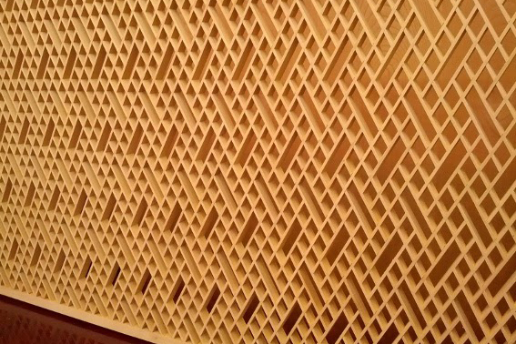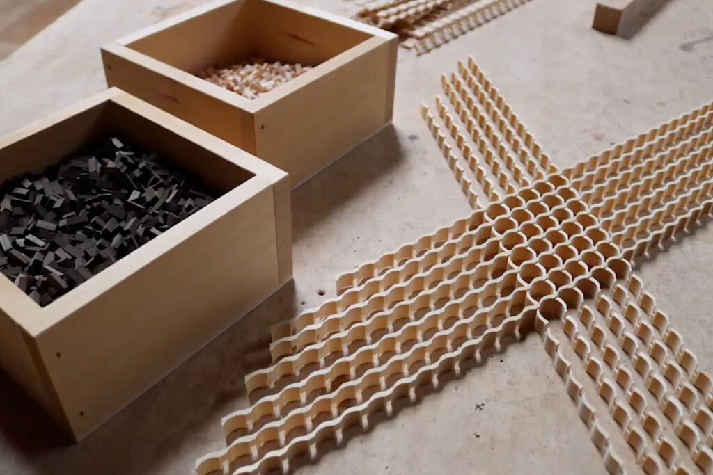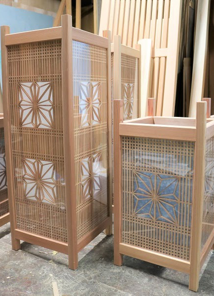釘や金具を使わずに、細い木材を組み合わせて幾何学的な文様を作り出します。